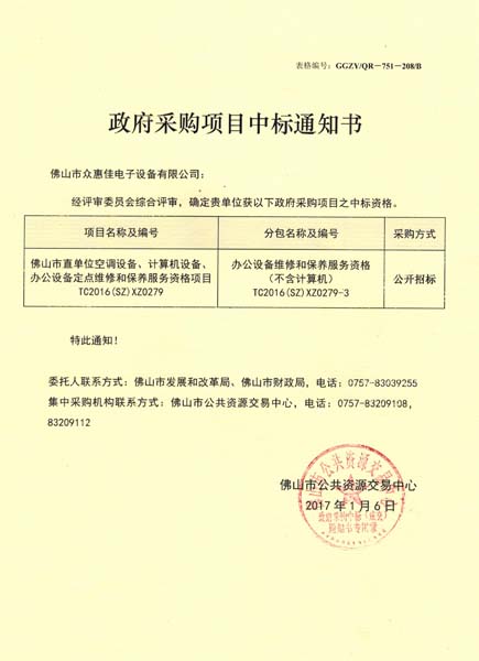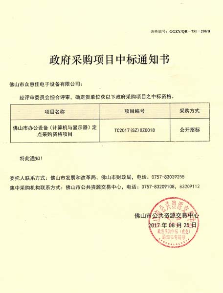 佛山市众惠佳电子设备有限公司成立于2013年6月。具有计算机及办公设备、视频会议、办公设备维修、打印机、服务器及交换机等政府定点采购认证资质。我公司为各行各业提供专业的IT技术服务,经过多年的努力与发展,已具一定的规模及实力,现拥有一支技术精湛的IT服务团队,以卓越的服务品质、专业安全的技术服务实力,为不同群体的用户提供更高更优质的IT服务。