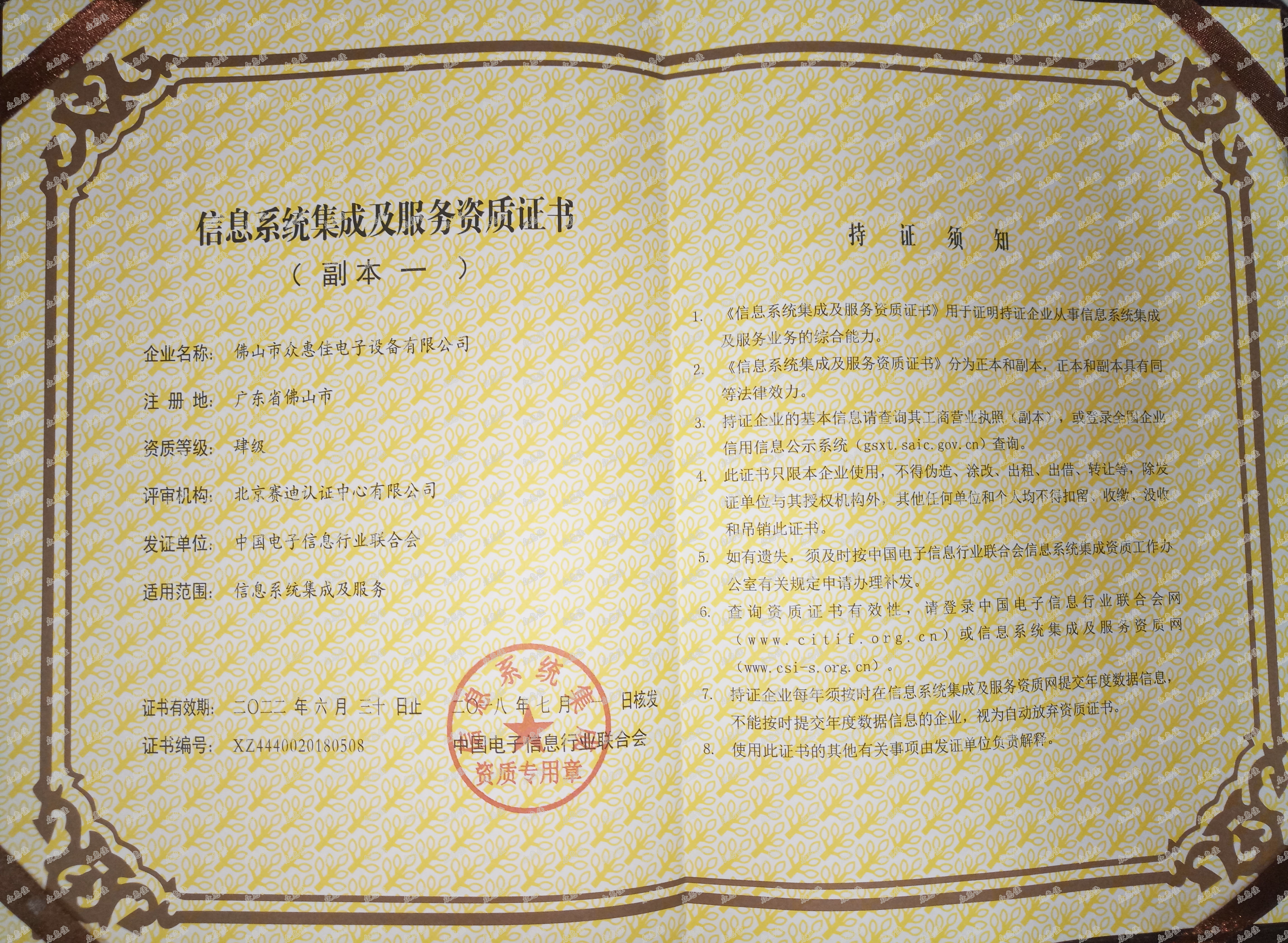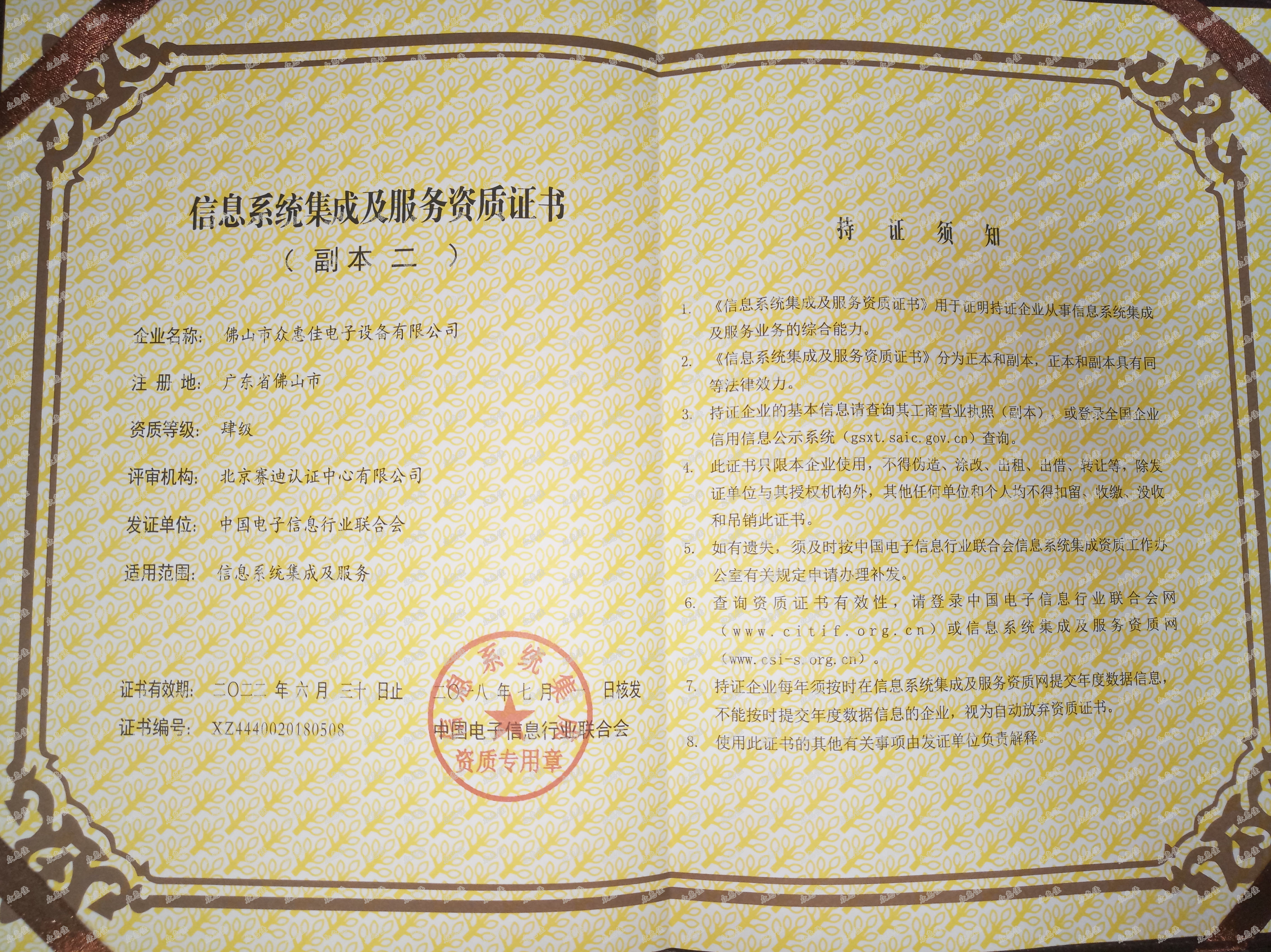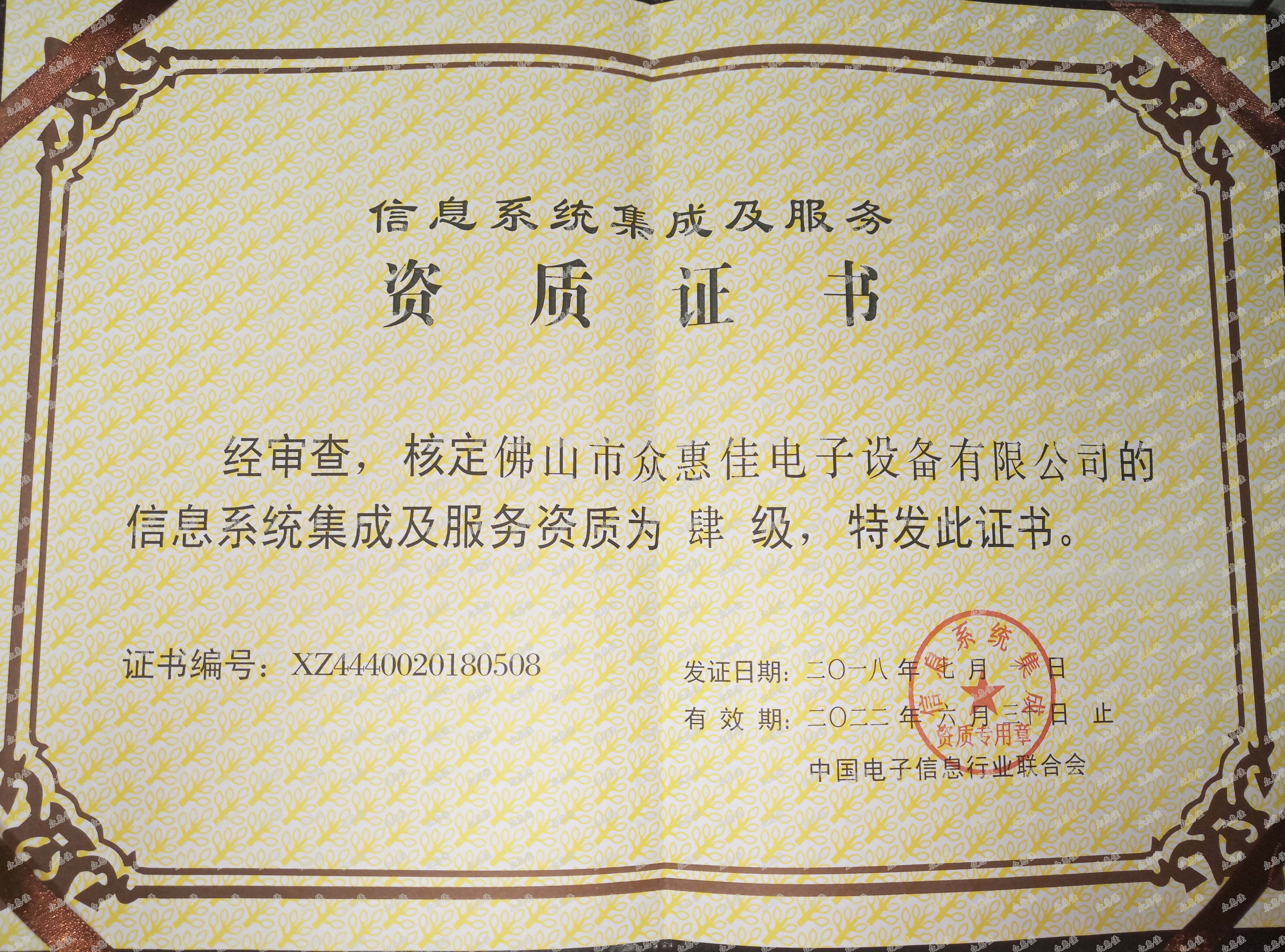 通过中国电子信息行业联合会审查核定,获得“信息系统成及服务资质四级证书”。